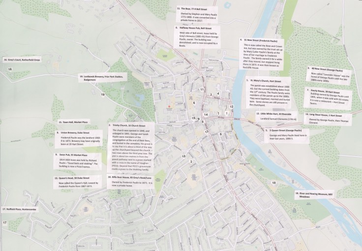 There is a map which I have made which points out places of interest (general) and places which are intimately connected to the Paulin(e) family in Henley. If you want a digital copy, please contact me. There is also a tour guide I created which gives you places of interest for England – highlighting places that the Paulins have lived, worked, played, and are buried.